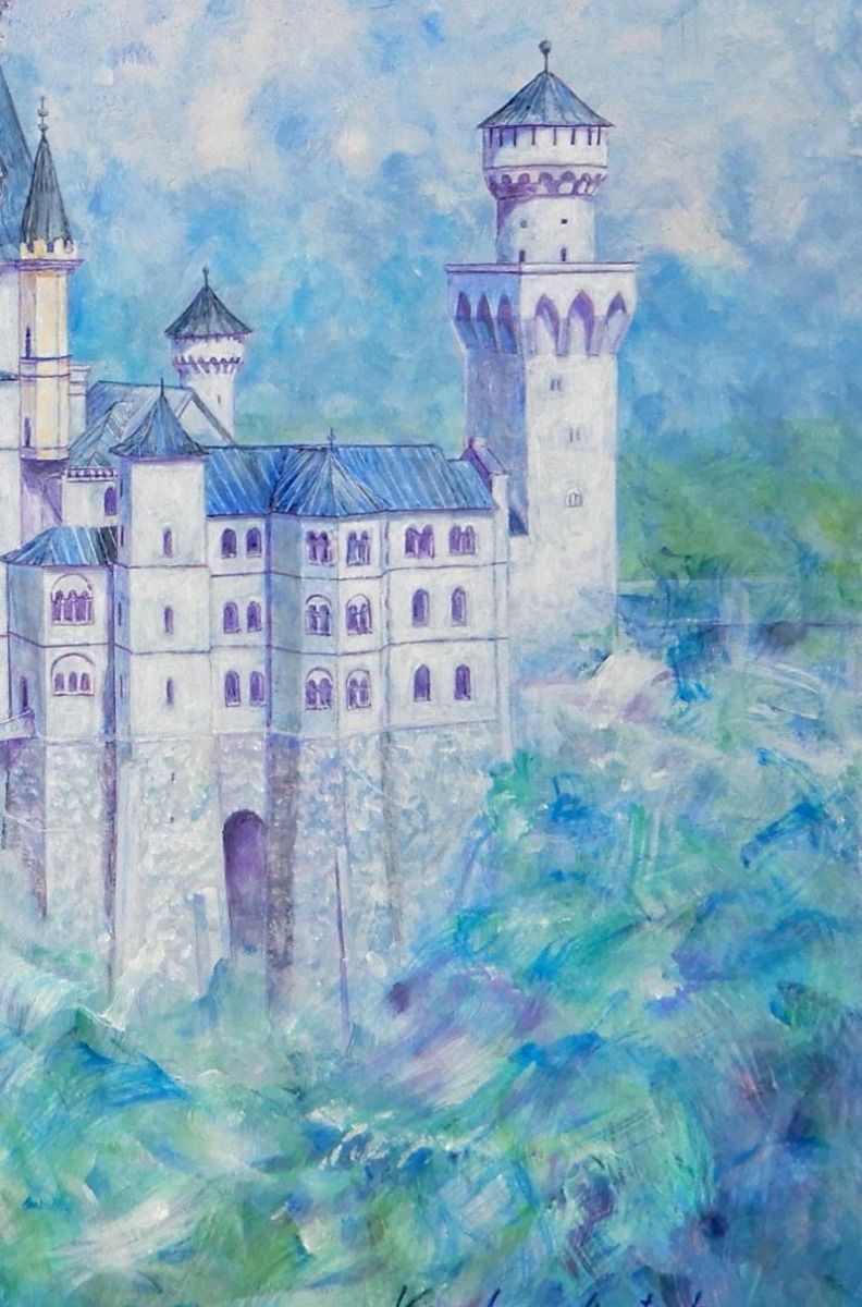 ロマンティックな城主のもとで建てられたドイツのノイシュバンシュタイン城。古城ではないものの思いを込めたお城という事でまさに中世の物語の舞台になりそうでもありながら、近代の技術をもって建てられたという2つの側面を持っています。城の名前の中の白鳥という言葉がその容姿を表しているようです。私は絵の持つ力というのは、まず目に飛び込んでくる情報に大きく左右されると思います。それが、部分的でも写実的であればより力強く、そしてすんなり入ってくると思っています。それを踏まえアタリを多くとり、なるべく実際の形に近づけるようにしました。絵のバランスを考え、右半分は縮小しています。城の崖下の木々は、寄せては返す波のように描きました。日に当たり輝くような面と影を落とした面のコントラストで、さわやかさを感じていただけたら嬉しいです。この作品は、外枠にはバーチ材を使用していますので、額装なしでもそのまま美しく飾ることが出来ます。反りや湿度に強い強固なMDF板に描かれています。