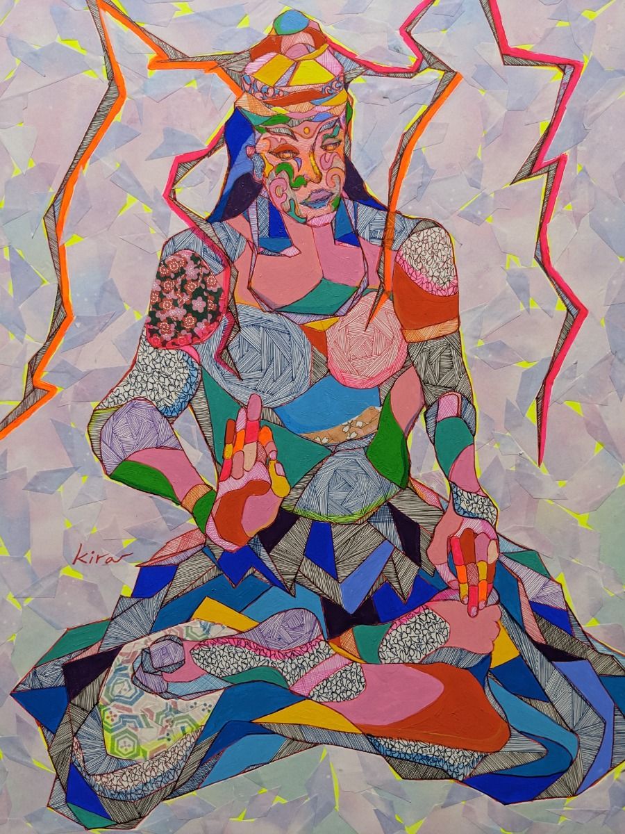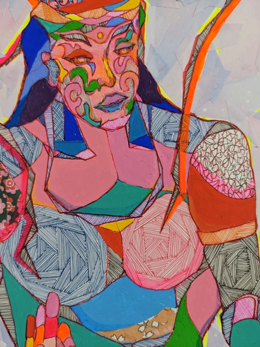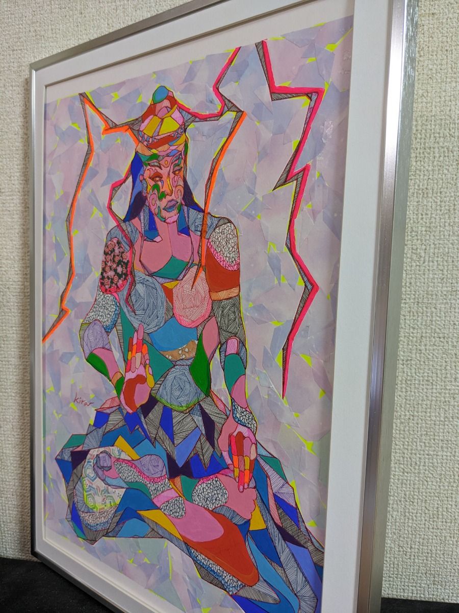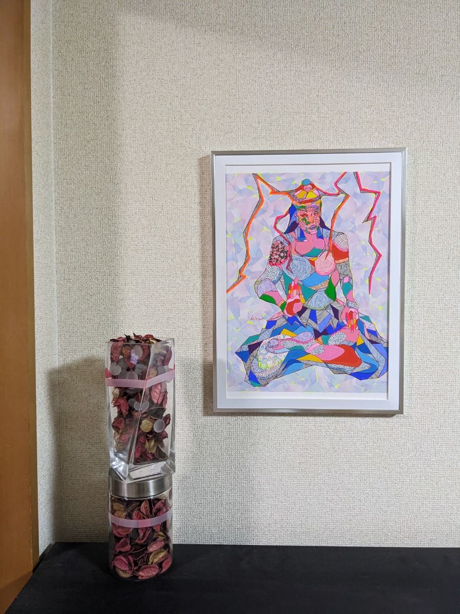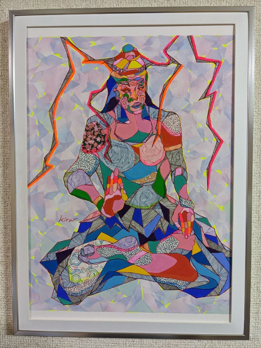 カラフルな「半眼」は、仏像の象徴的な表現を反映した独特な作品です。この作品は、半分自身、半分世間を見つめる意味を持ちます。