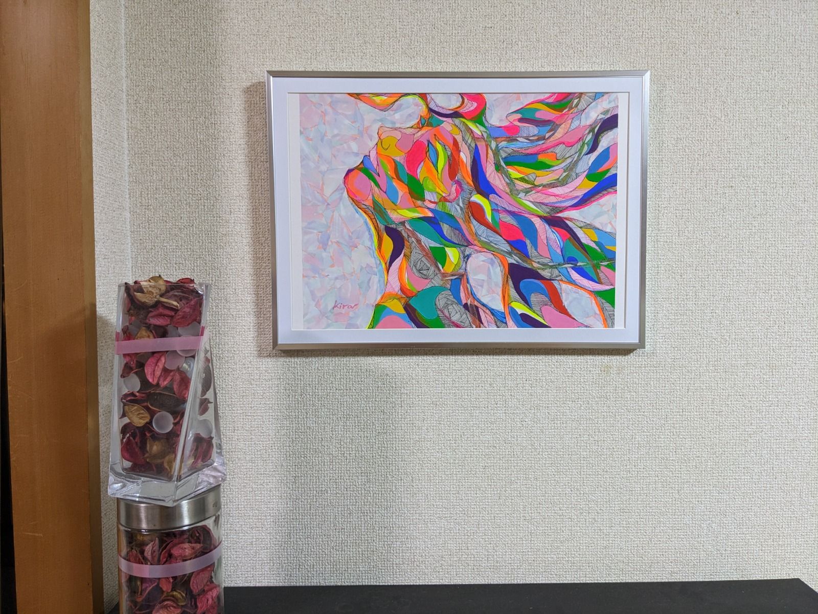 流れる風と流れる色が調和し、爽やかな空気感を届ける作品です。 見る人に心地よいひとときを提供します。