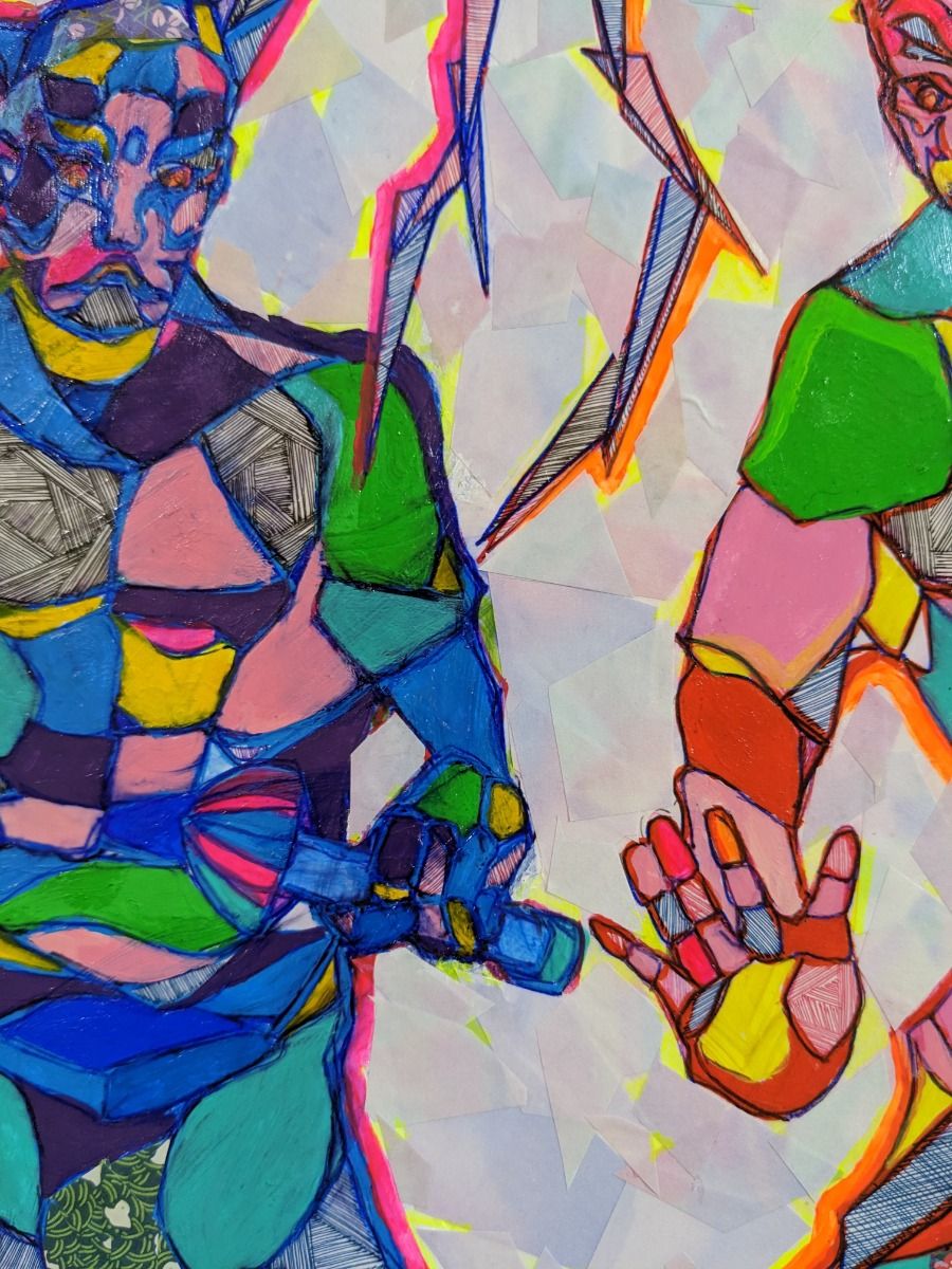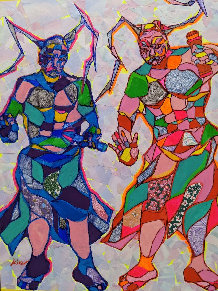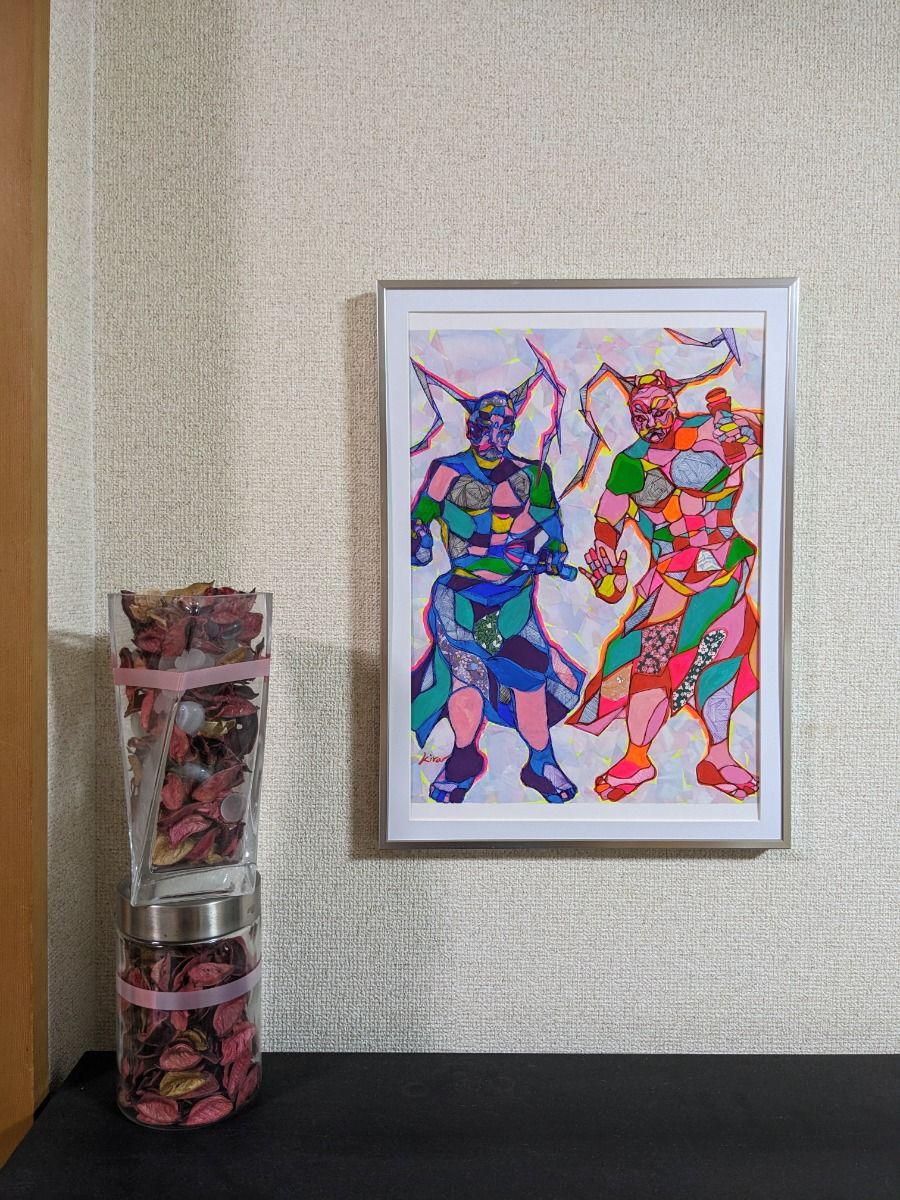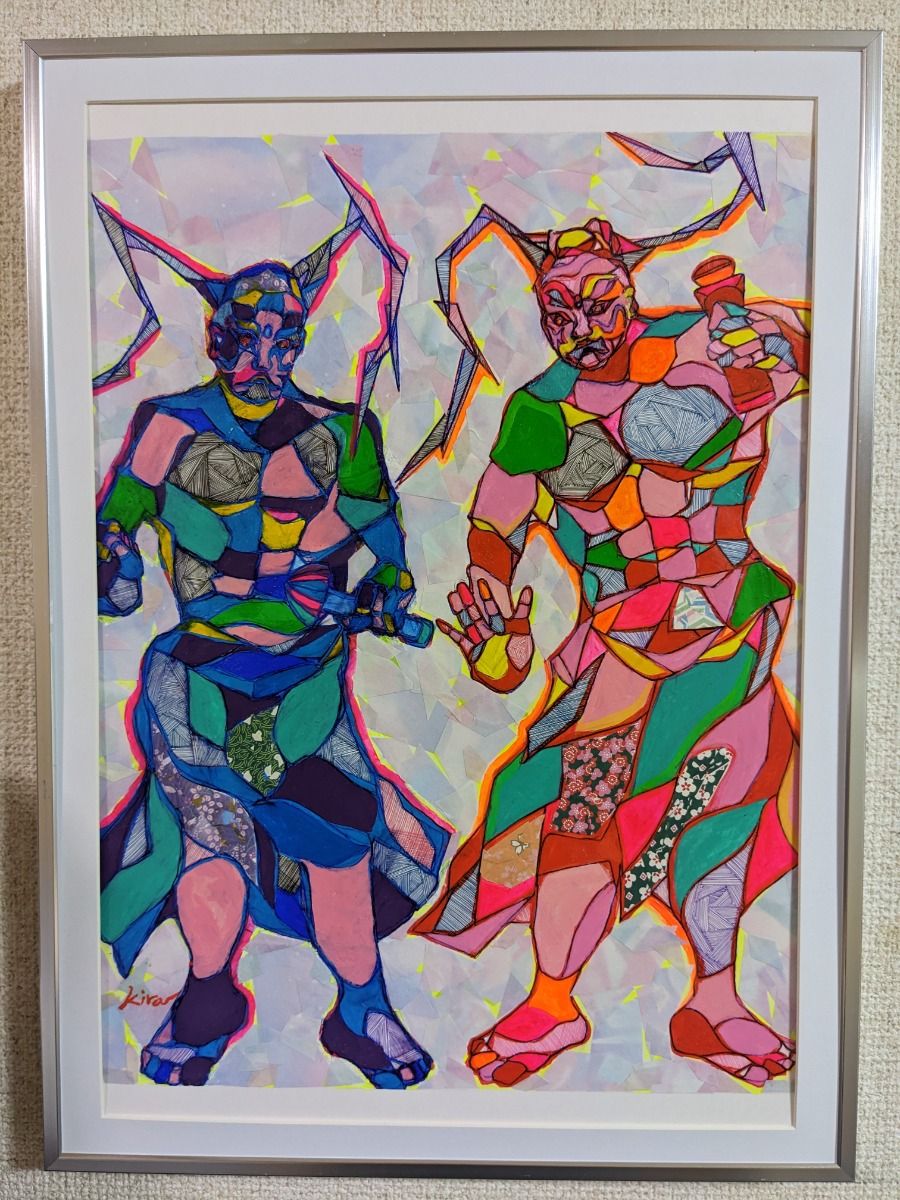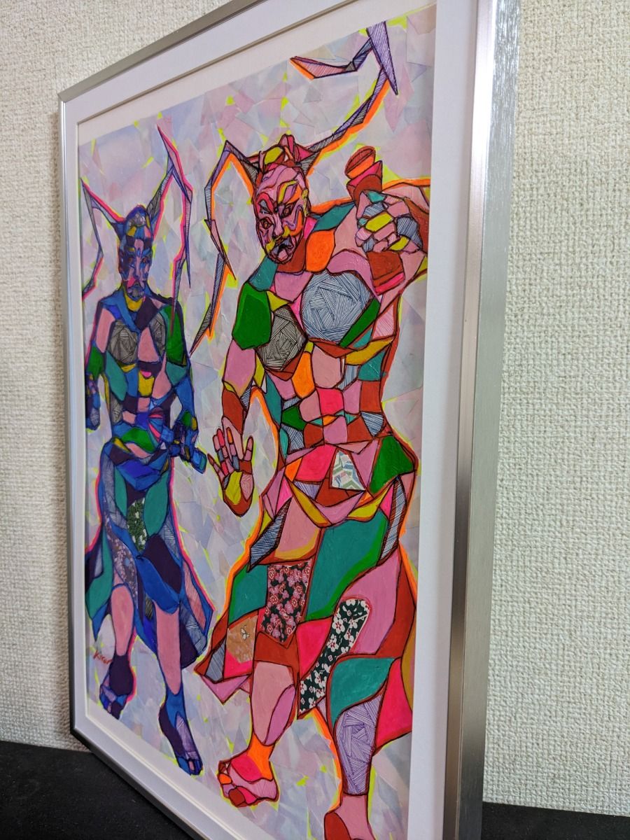 阿吽2は、陰と陽、相反するものが調和する美を感じる作品です。この作品は、見る人に深い感動と共鳴をもたらすことでしょう。阿吽の神秘的な概念を、色彩と形で巧みに表現しています。 作品のサイズはA3で、オリジナル原画の一点物です。額も付いていますので、ぜひお部屋に飾り、作品の持つ魅力をお楽しみください!