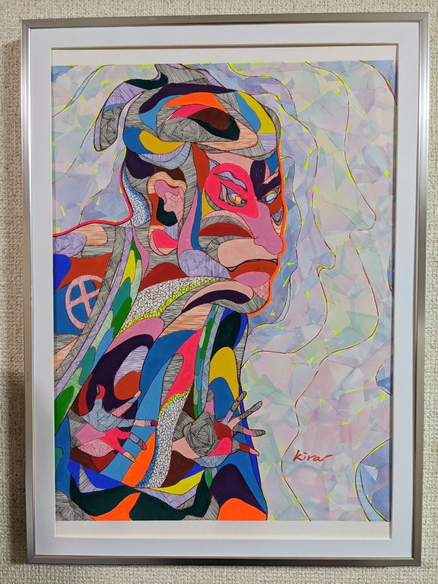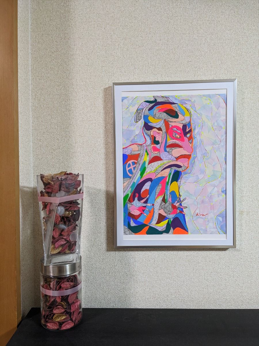 カラフルに描かれた「東洲斎」は、写楽の代表作を鮮やかに再現した作品です。この作品は、多彩な色使いで見る人に美しさと感動を届け、空間を華やかに彩ると想います。 0.28mmボールペン、コラージュで立体感を生み出し、アクリルでその深みをさらに引き立てています。 新品のアルミ製の額も付いていますので、すぐに部屋に飾ることができます。透明性の高いアクリル板とマット付きです。 絵のサイズはA3で、オリジナル原画の1点ものです