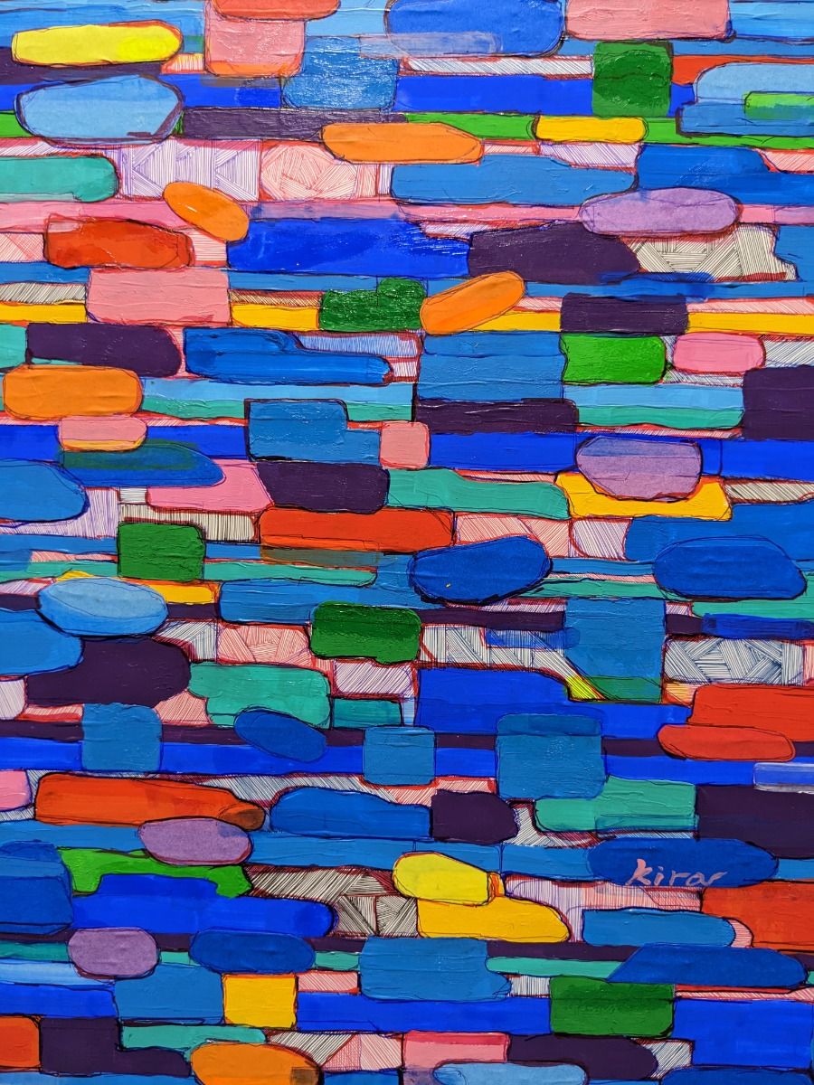 力強い色彩が鮮やかに交錯するボーダーのデザインが特徴的な作品