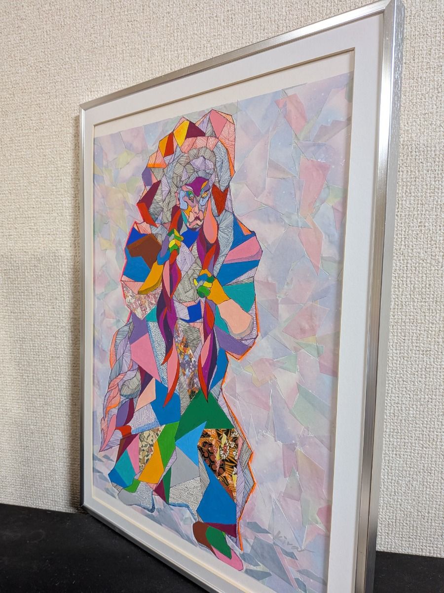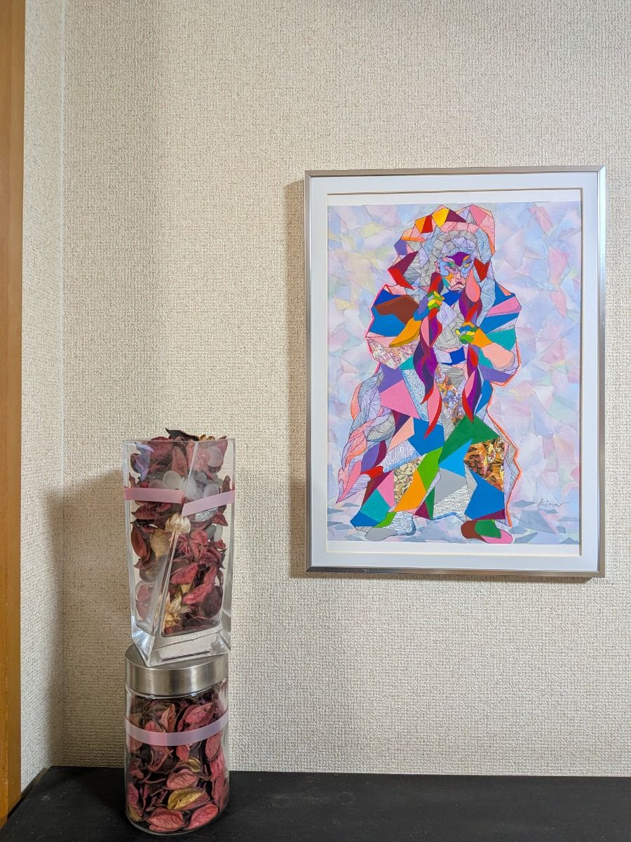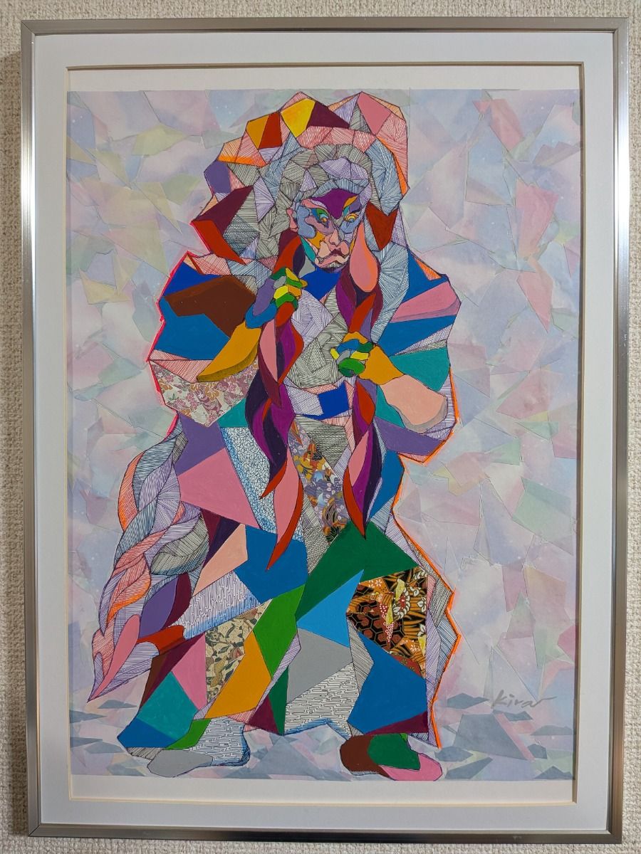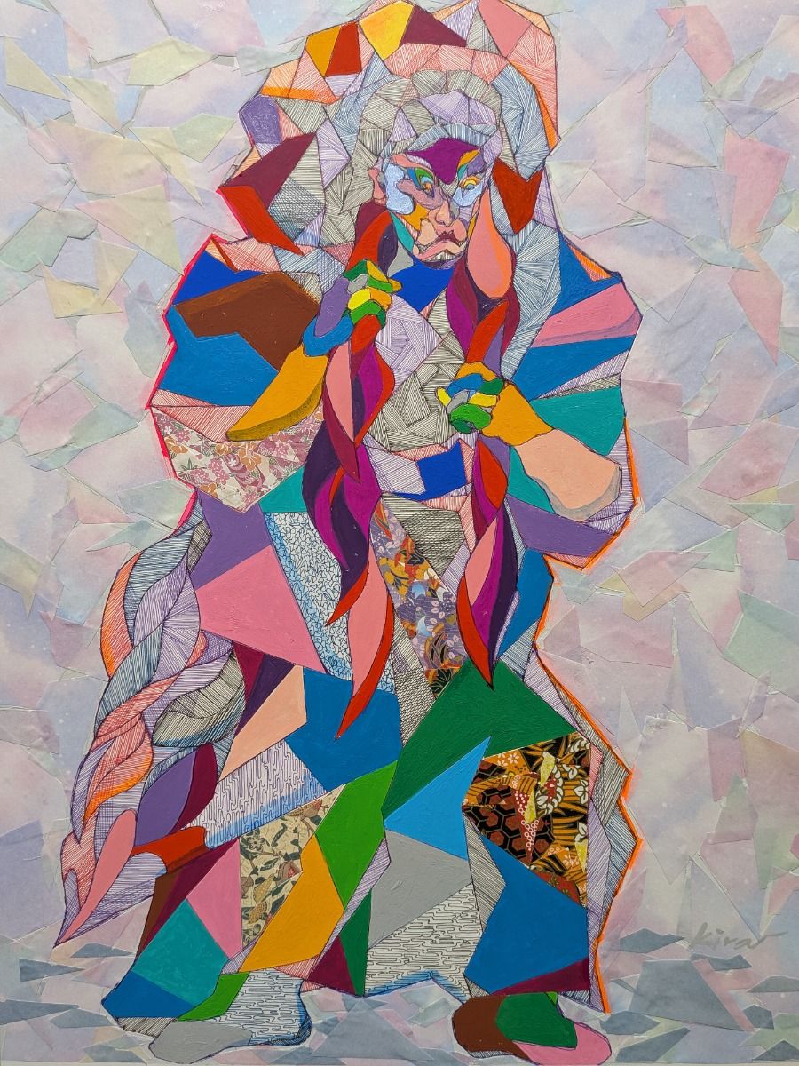 この人物は、ひとつの形として存在しているのではなく、 無数の断片によって支えられています。 色、線、模様は感情や記憶、時間の層を象徴し、 それらが崩れそうになりながらも、 なお立ち上がろうとする意志を形づくっています。