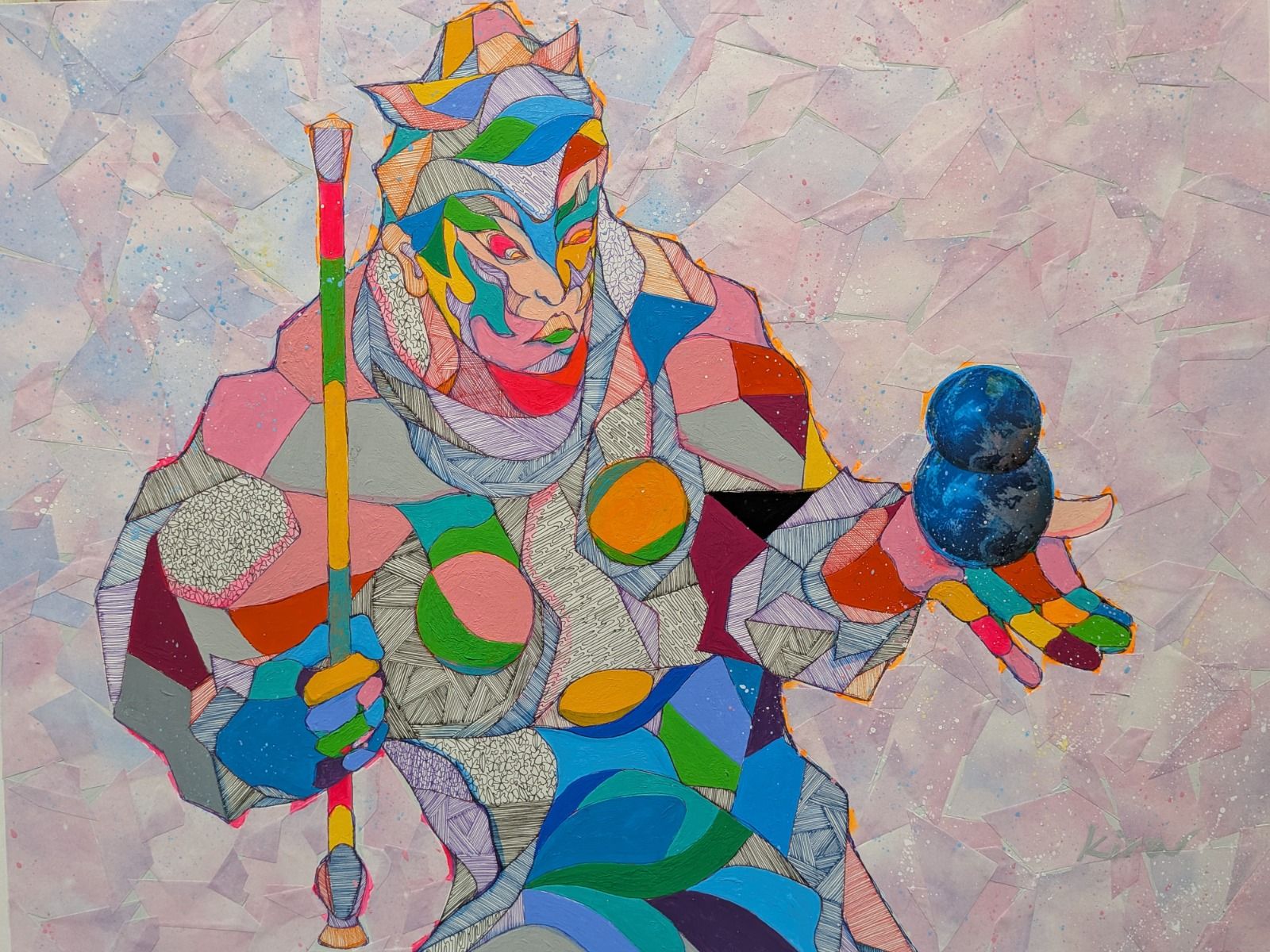 世界はひとつの形をしていない。 砕け、重なり、色となって、いまも更新され続けています。 手のひらに載せられた小さな地球は、 支配ではなく、託された存在として描きました。