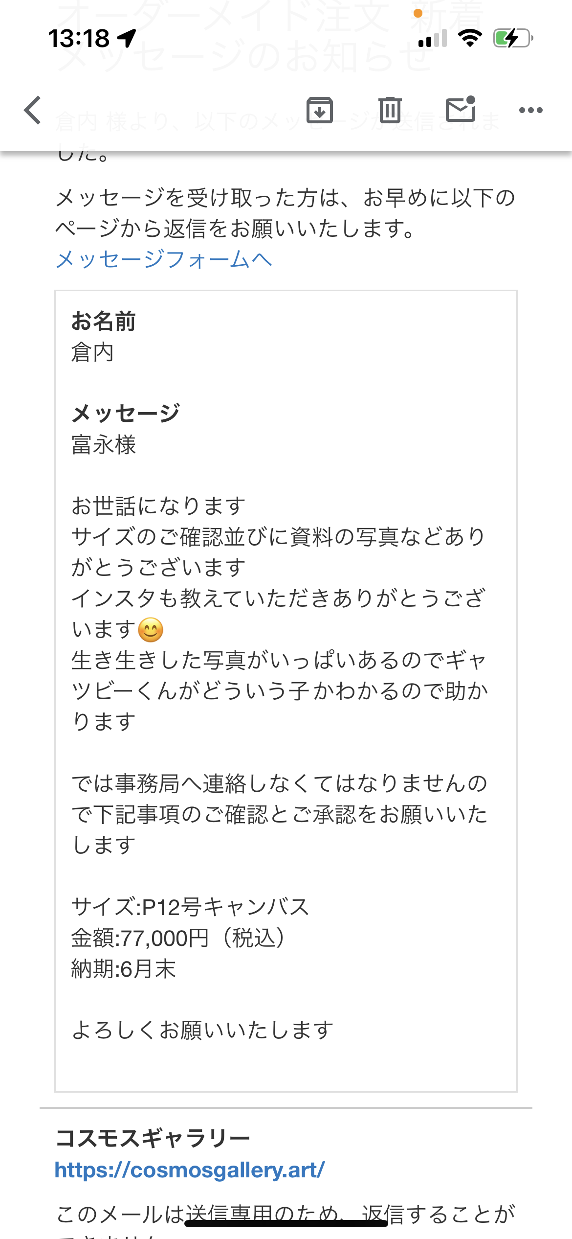メッセージのやりとりを通じてご注文の詳細が確定しましたら、作家さまからコスモスギャラリー宛に注文確定のご連絡をお願いします。その後、ギャラリーからご注文者さまへ、前金の決済フォームをお送りいたします。