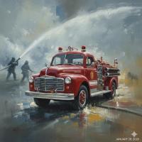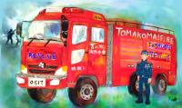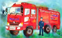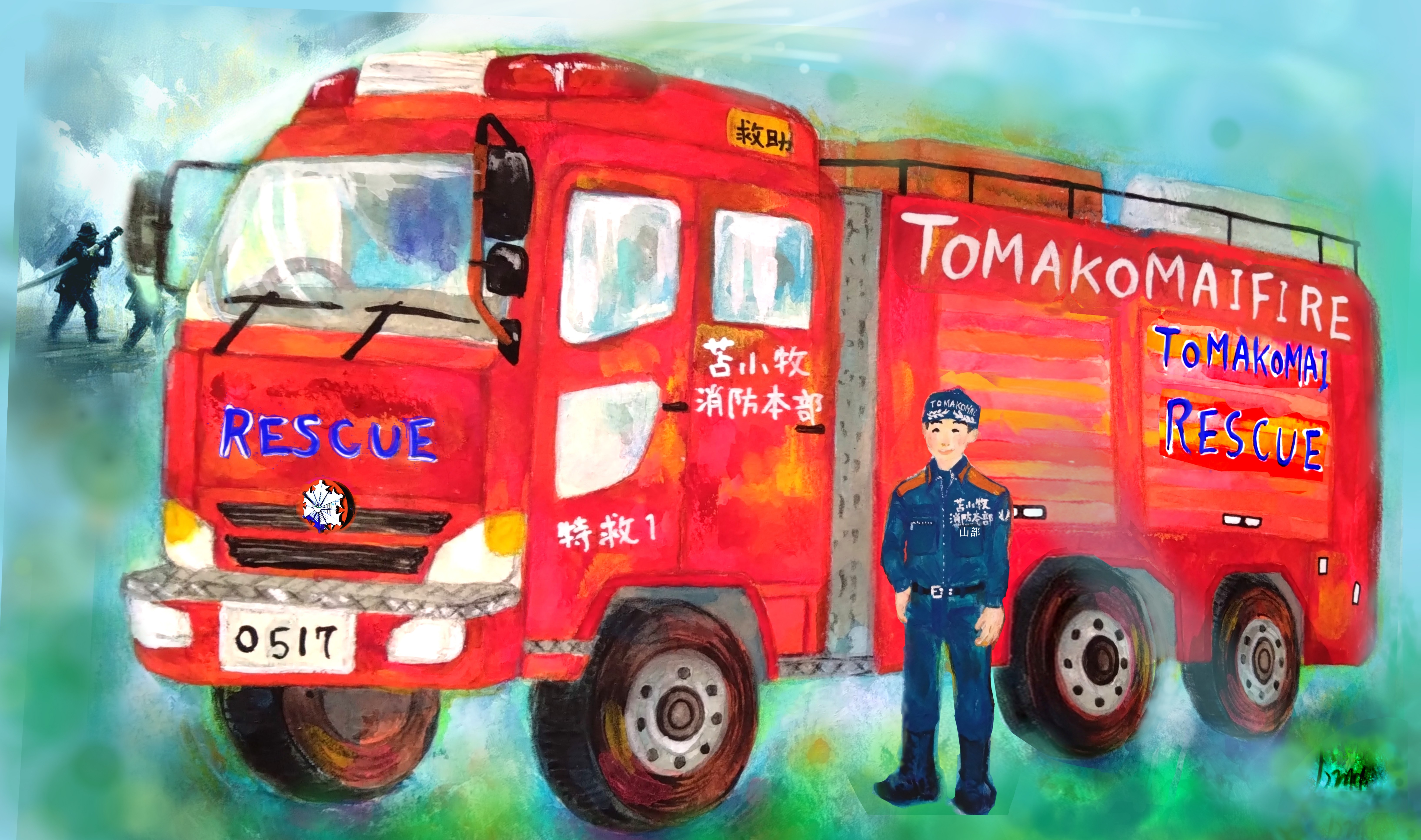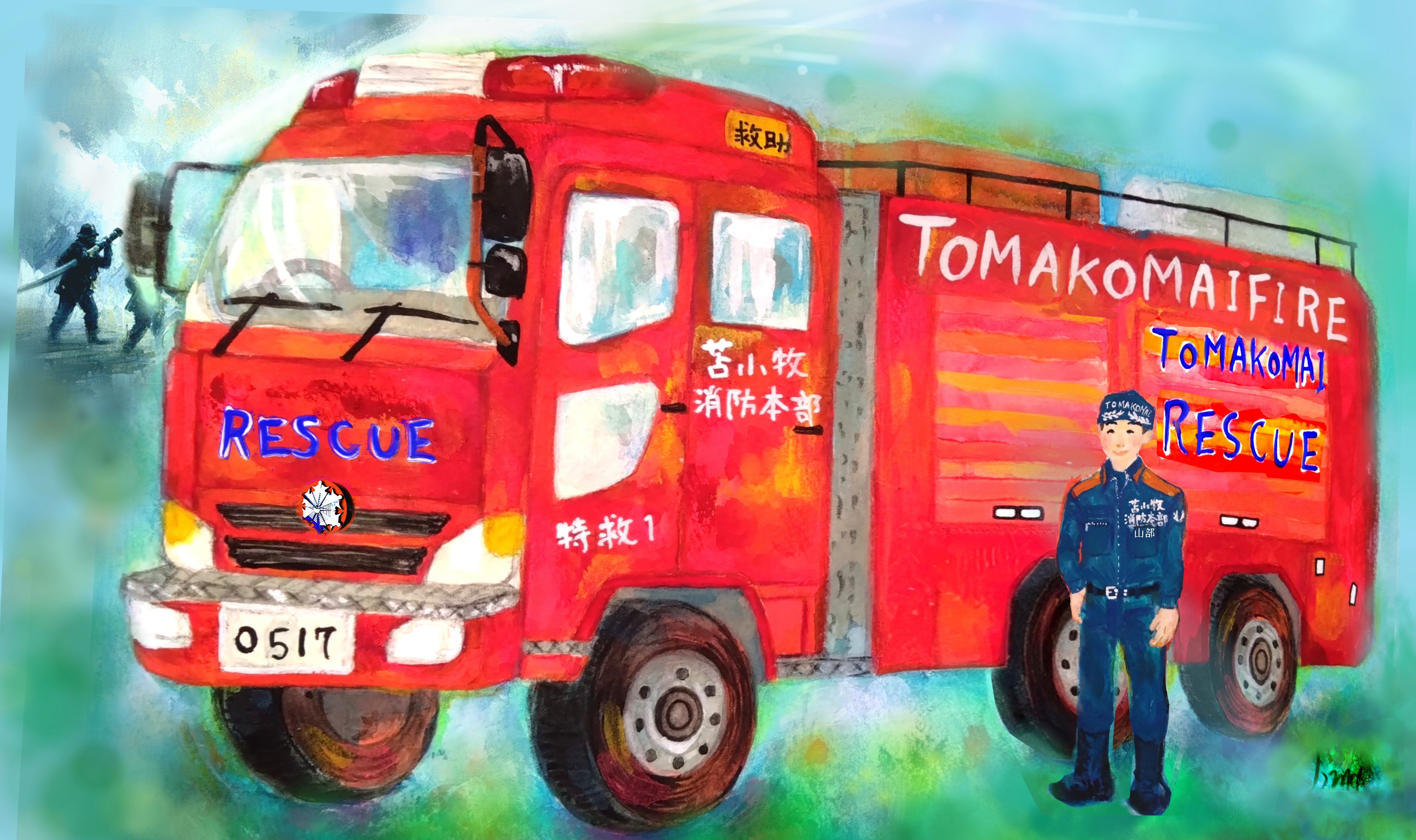 2. 添付した画像のような全体の構造で、消防車の絵をもう少し奥行きを感じられるように斜めに描いていただきたいです(消防車に描かれた文字は見える程度)。